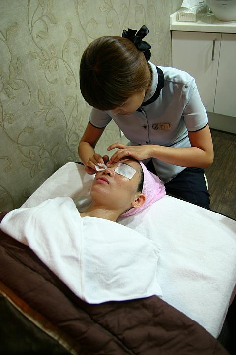 荷物はロッカーに入れ、着替えて施術室へ行きます。まずはクレンジング→ディープクレンジング。マッサージするように、念入りにクレンジングしてくれます。高周波の器械を使ったあと、I2PLのレーザーの刺激や痛みを緩和するジェルを顔全体に塗ったら、レーザー室に移動します。