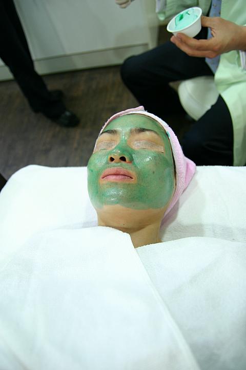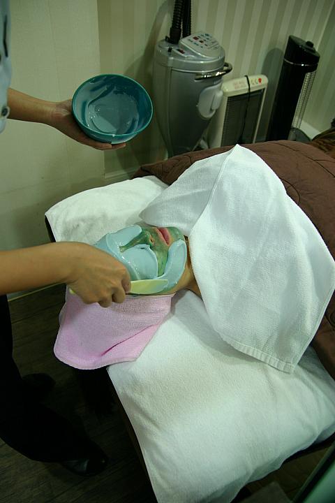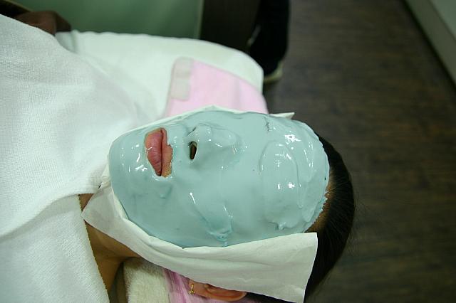 次に、Obaji Blue Peelに入ります~。肌が落ち着いたところで、次のObaji Blue Peelに入ります。こちらも液体を塗るだけのようですが、ちゃんと先生が直接施術してくれます。「徐々にピリピリきますよ~」といわれ、また覚悟していたんですが、最初はこれといって反応なし。痛くもかゆくもありません。ほぼ顔全体に液体を塗り終わったあたりで、ピリピリ、ピリピリ…ときました。でもすぐにヒンヤリしたパックを塗ってくれたので、ピリピリ感もおさまり一安心。たっぷり青い沈静パックを塗った状態で待ちます。5~10分ほどしたら、マスクを取って、洗顔しに行きます~(いや~、デビルみたいな顔になってますね・・・ぷぷっ)。
