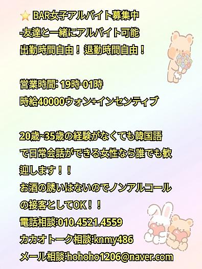 20歳〜40歳 仕事経験なくても韓国語で日常会話できる女性なら誰でも歓迎します!!お酒の勧誘はないのでノンアルコール接客でOK!