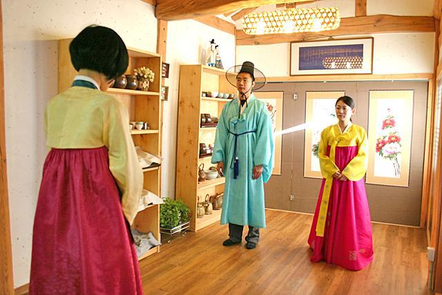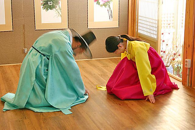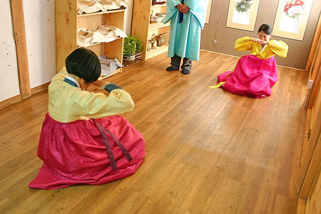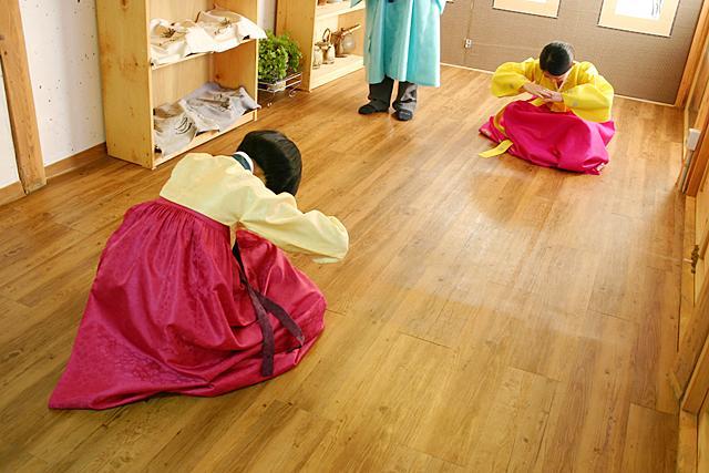 そしてお次は伝統的なお辞儀の仕方を教えてもらいます。ドラマなんかでもたまに見かける、深々と頭を地面に近づけてするこのお辞儀は、男の人と女の人でやり方が違うそう。また、お辞儀の種類も簡単なお辞儀やと最敬礼を表すものなどいくつかあり、現在では秋夕やソルラル(旧正月)、ご先祖様の命日に行うチェサ(祭祀、法事)の際にはこのお辞儀をご先祖様に捧げるそうですが、昔は夫婦同士で、また子供が両親に毎日朝晩やっていたとか。あっきーは女の人のお辞儀の仕方を、両班になったマレーシア人の男性は男の人式のお辞儀をやってみました。