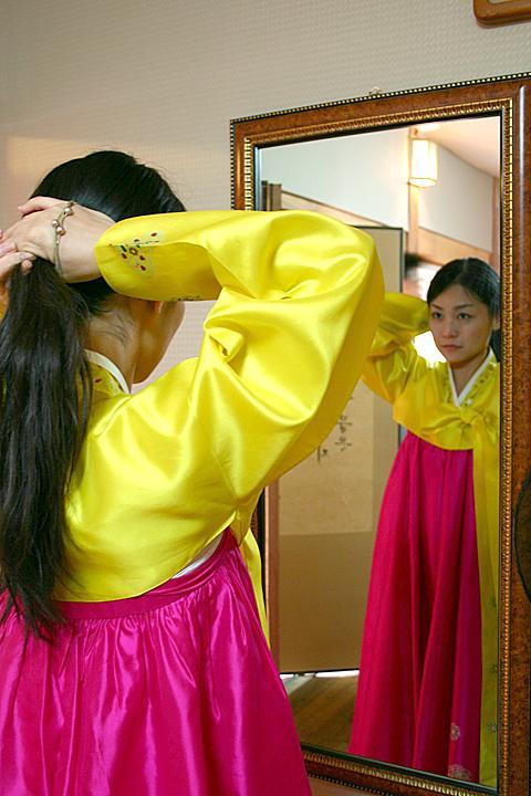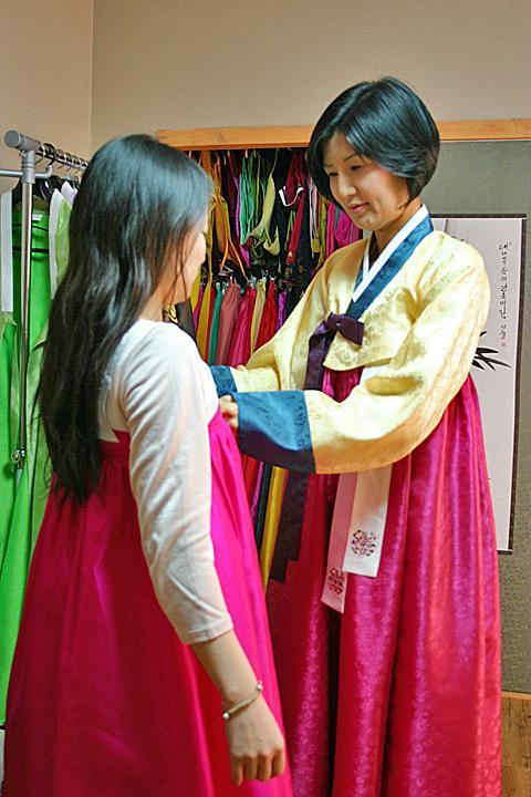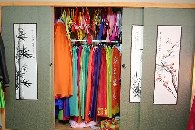 さてお次は韓国の伝統衣装、韓服(ハンボッ)を着ての体験。引き戸の収納庫の中にいっぱい揃えられた色とりどりの韓服の中から着てみたいものを選べます!男性用もあるのでカップルで来ても楽しめそう^^。このカラフルな韓服って見るだけでも楽しい気分になって「どれにしようかな??」って迷ってしまいますよね!?そんな時は韓服担当のYooファミリー息子さんの奥様に似合うものを選んでもらいましょう。あっきーは鮮やかな黄色のチョゴリ(上着)と濃いピンクのチマ(スカート)を選んでもらいました?。着付けは息子さんの奥様が全て手伝ってくれますョ!