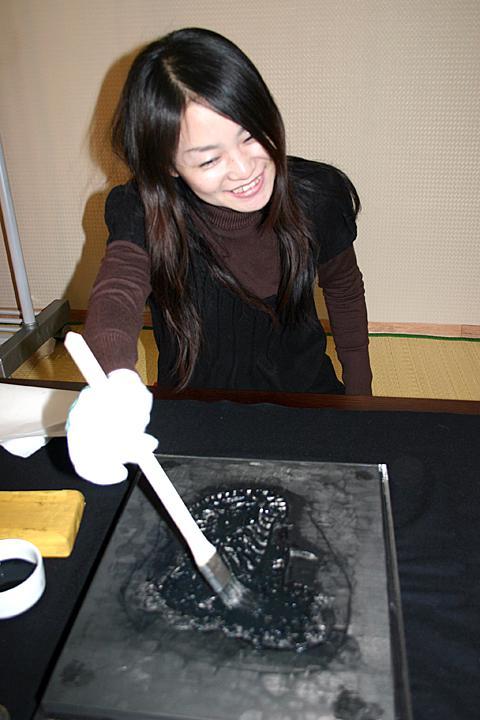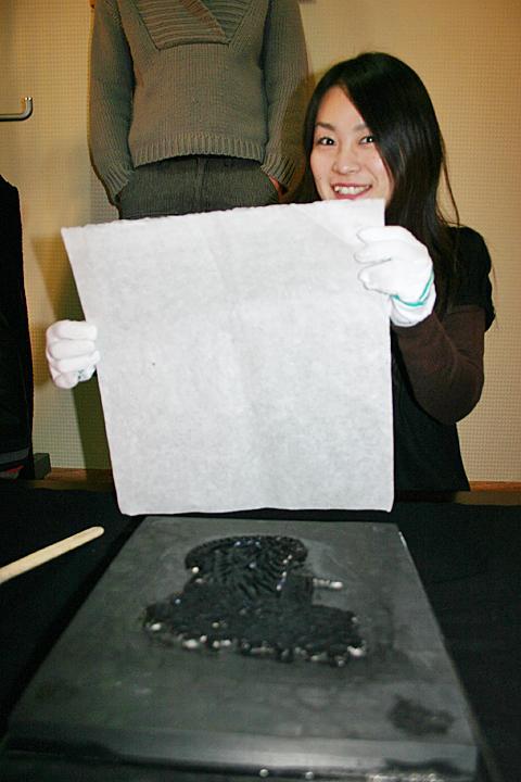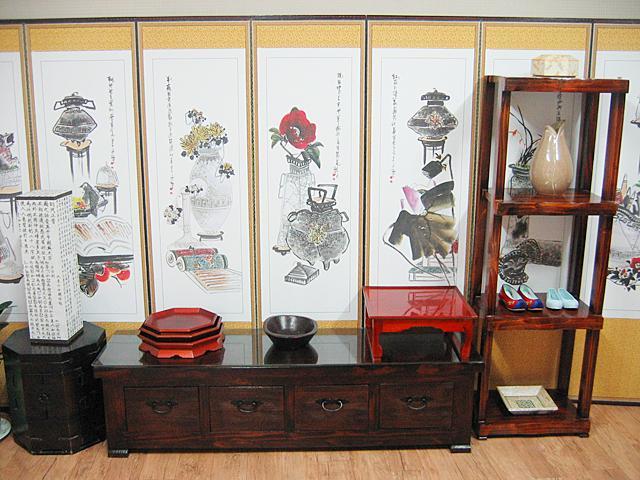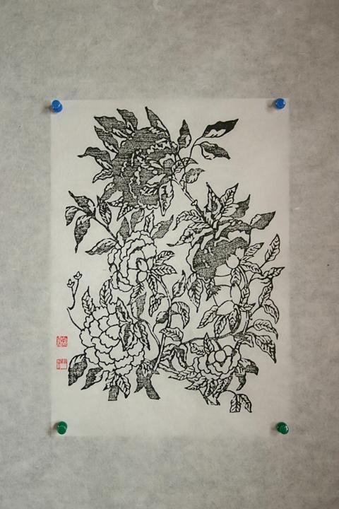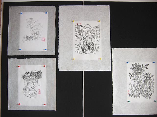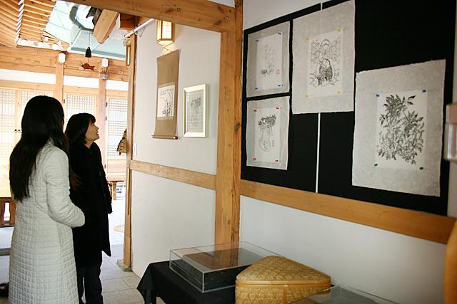 民画引き出しとは、鳥や動物、花などの絵柄を彫った木版に墨をつけて紙にする、いわゆる版画みたいなもの。木版に彫られた絵には一つ一つ意味があるそう。たとえば虎は魔除け、鳥は夫婦円満、鯉が池から空に向って昇っているのは出世、といったような意味を持ち、それを飾ることによって縁起をかつぐんだとか。Yoo`s Family、兪(ユ)さん家の娘さんがいろいろ説明してくれました。この民画引き出しは、暖かい季節には屋外で韓屋を眺めながらするらしいのですが、と?っても寒い今の季節はオンドルの効いた部屋の中でやります。