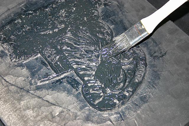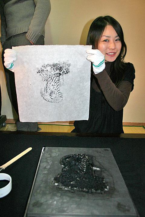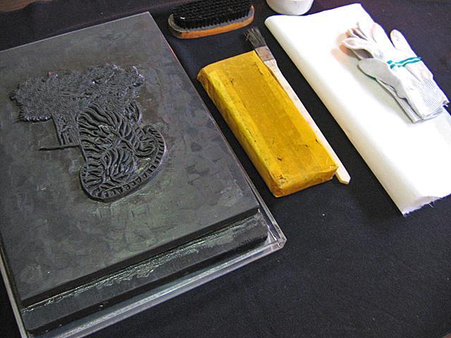 左が絵の彫られた木版。墨を塗る筆や軍手などが用意されます。