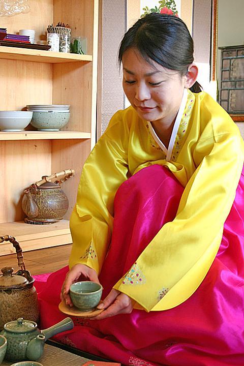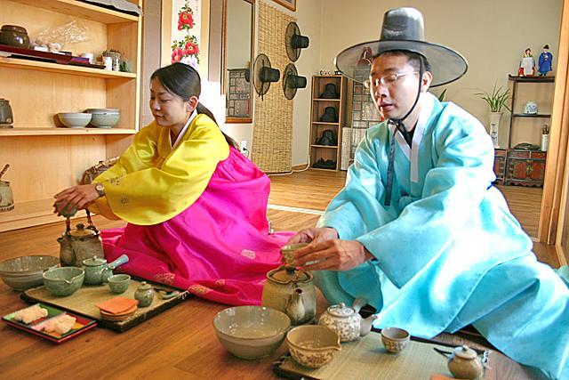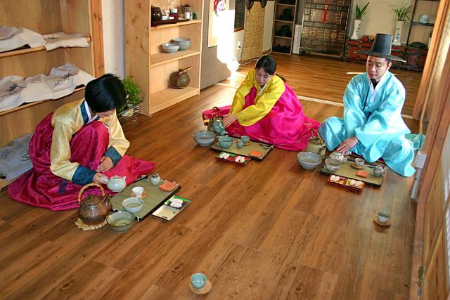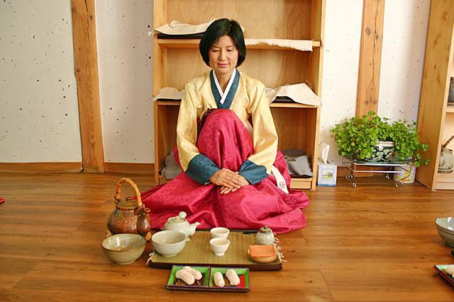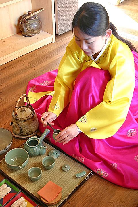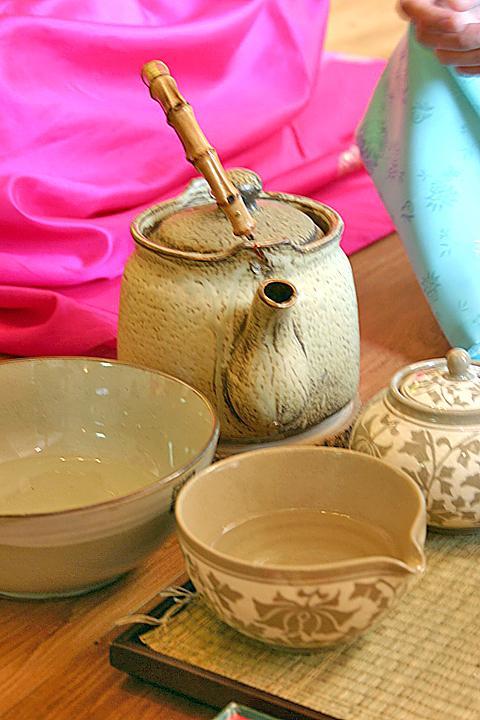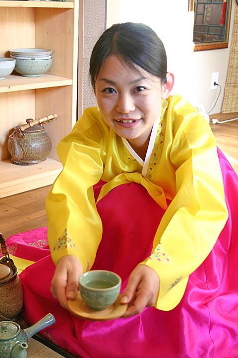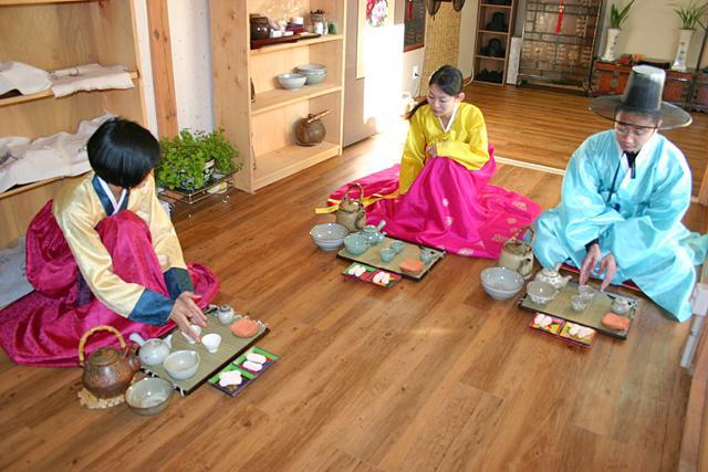 このように一連のお茶の入れ方から飲み方、細かい作法なども教えていただきます。使う道具やお茶の種類は日本のお煎茶に似ているけれど、韓服を着て雰囲気たっぷりの中で韓国風のお茶の作法を学べるなんて貴重な体験。