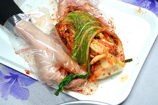 キムチの材料は、薬味類は全てボールに用意されていて、白菜もあらかじめ塩漬けされたものを使います。あとは大根やセリなどのお野菜を切って、ボールに薬味を入れて混ぜるだけ!そうやって作った真っ赤なキムチのヤンニョム(薬味)を、塩漬けにした白菜の葉っぱの間に挟んでいきます。あとは一番外にある葉っぱで全体を包んで出来上がりっ。意外とカンタン?!お家でも出来るかも!?と思ったくらいでした。あっ、途中で試食もできますョ!まだ漬ける前のキムチだけど、これがオイシイ?^^!出来上がりが一層楽しみになっちゃいます。