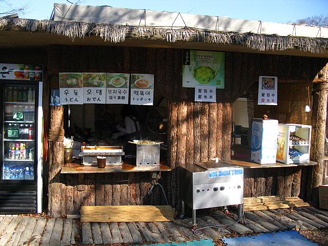 記事をずーっとご覧になってると「なんで11月なのにそんな厚着してるの!?」と思われる方がいらっしゃるかと・・・。実は今回ツアーに参加した日はこの秋1番の寒さ!ソウル市内の昼間でもマイナス1度ぐらいまでしか上がらなかったんですが、テーマパークがあるのは山の中!午前10時を過ぎてもテーマパーク内の温度計は、マイナス5度くらいしかなかったんです・・・。あちらこちらと一通り歩いたら、カチコチに冷えたので、あっきーと一緒にテーマパーク内のトッポキ屋さんに避難!(笑)トッポキもオデンも予想以上においしくて冷えた身体には最高のご馳走でした。(笑)