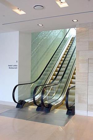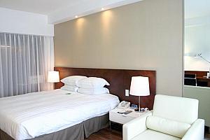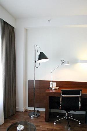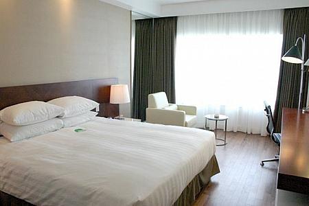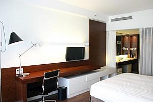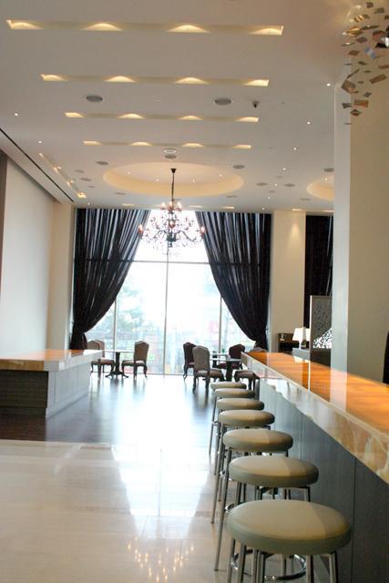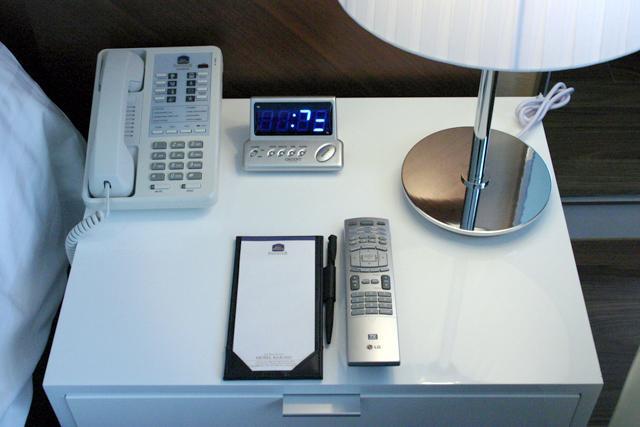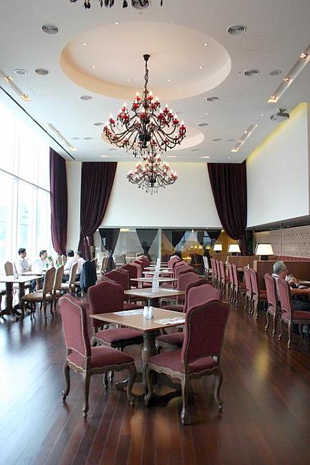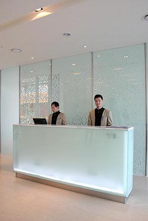 フロントはホテルエントランスから入ってエスカレーターで2階へ。とってもシンプルなインテリアで、天井が高いので開放感もたっぷり。ロビーの椅子はちょっと少ないですが、フロント前には無料で使えるインターネットPCが2台あり。ちょっとした情報チェックに便利です。またここに朝食、ティータイム、ランチ・ディナーまで楽しめるカフェがあります。こちらはセキュリティー管理のために、宿泊者以外客室階へエレベーターで上がれないようになっているので、エレベーター内のセンサーにカードキーをあてて宿泊階のボタンを押しましょう!