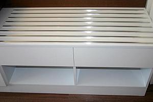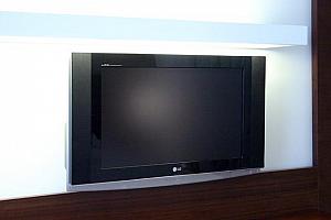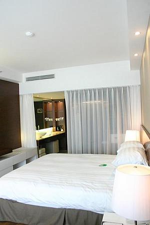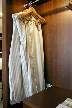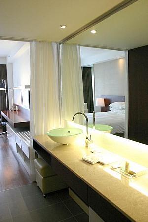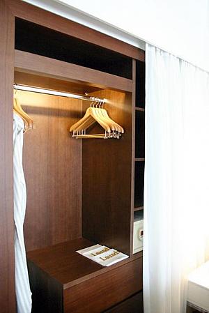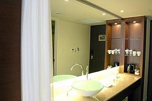 プレミアダブル、プレミアツインをのぞいてみると、洗面台はバスルームではなく玄関前に配置され、大きな鏡が横長に張られたドレッサー兼用タイプ。また壁掛け平面テレビ側に設置された横長の台にはスタンドもついてビジネスデスクとしても使えます。そしてベッド横のクローゼットはドアがなくカーテンのみ。その分スペースが広く使えるようになっています。
