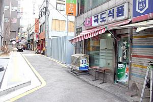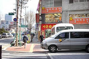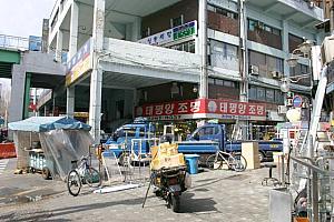 まずホテルを出発すると、周辺は地元の電気・印刷・インテリアなどの問屋通りが広がり、その間に地元の食堂やお店がちらほら。途中で食事でも、という方はホテルの方にオススメ店を聞いて行ってみてもいいかも知れません。ちなみに有名どころでは、徒歩約10分圏内にオジャンドン冷麺通り、プルコギの老舗があり。また冷麺通りの向いには中部市場といって干物の問屋市場もあるので、覗いてみるのも楽しいと思いますよ。
