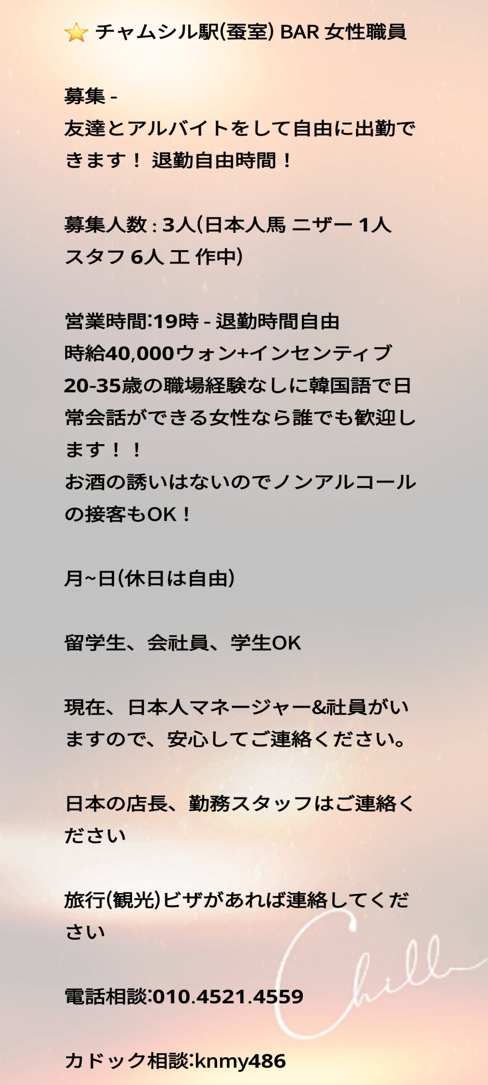 20-35歳の職場経験がなくても韓国語で日常会話ができる女性なら誰でも大歓迎!! 酒の誘い