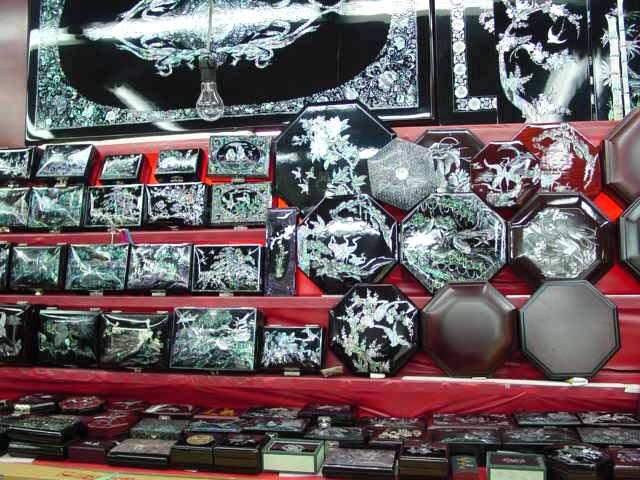 日本にもある漆塗りのお盆、お茶と御茶菓子や果物を載せるチェンバン(小さい茶托)が日本人に人気とか。韓国では、昔から結婚する時に女性が家具を揃え、男性が家を用意するといわれますが、女性の婚礼家具として最高級の品が貝細工の家具。ここでは小引き出しなど、お手頃で持ち帰りのラクなものが人気。種類もお盆、茶たく、小引出しなどいろいろあります。