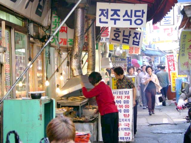 焼き魚通りまでは駅から少し歩かなければならないので、もう少し近場でという方は、次に向かうチョンデムン11階の食堂フロアで食事してもいいかもしれません。こちらの地元の人がよく利用する食堂ですが、フードコートとは違って1軒、1軒お店になっている専門店タイプ。安いし料理もなかなかですョ。※現在リニューアル工事が進み、営業していないお店が多数あり<2006.4.24>