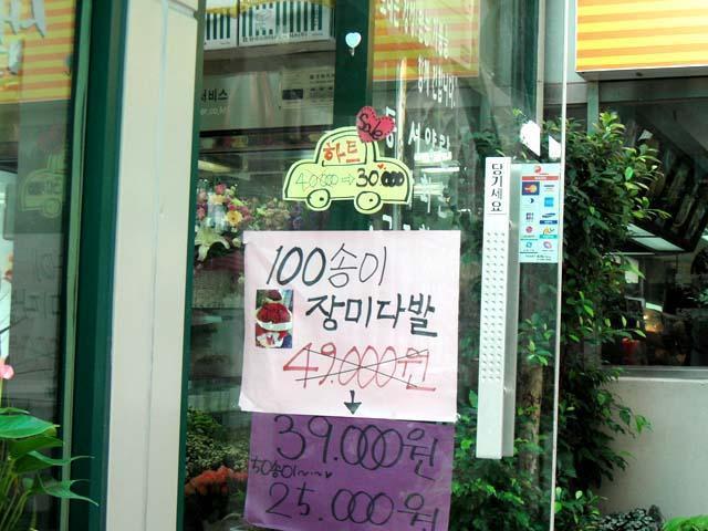 さすが韓国!もちろん花屋だってキャンパス内にあります。 こちらは「バラ100本39000ウォン」と書いています。やはり付き合って100日目のペギルキニョン(100日記念)にはバラを・・・ということなんですね(韓国ではカップルの男女が付き合って100日目に記念のお祝い?!をする習慣があります)!ちょっともらってみたい(笑)と思う、まいです・・・。