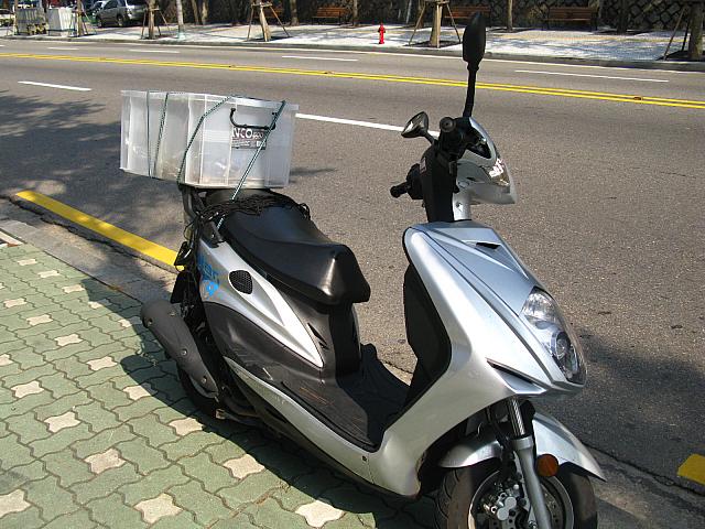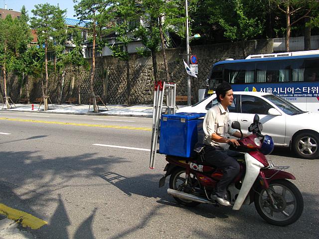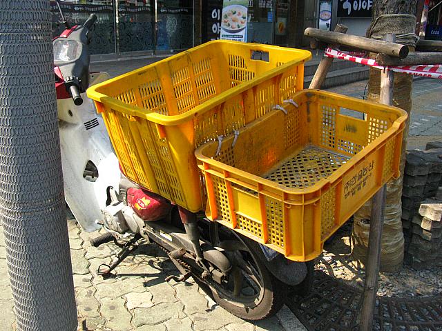 バイクは荷台を使うと物を運ぶのにとっても便利。韓国では、こうやって荷台に箱をくくりつけて、荷物を運びやすくしているバイクをあちこちで見かけます。