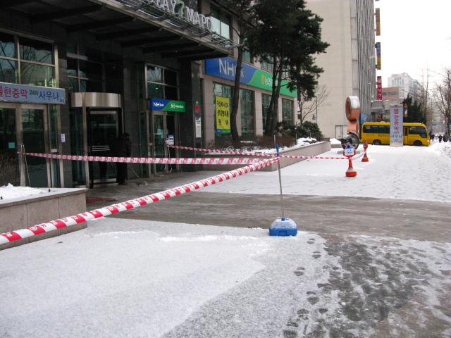 そういえば!最近ビルの周りに見かける赤いテープ!なんだと思われます??上から落ちてくる氷柱が人に当たらないようにテープで立ち入り禁止をアピールしてるんです!ナビも初めて知りました^^;