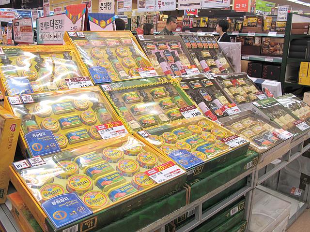 一番最初に目を引くコーナーに出されているのは、チャムチ缶(ツナ缶)。油やホンチョ(紅酢)とのセットも多いです。これは、誰がもらっても嬉しいですよね~。