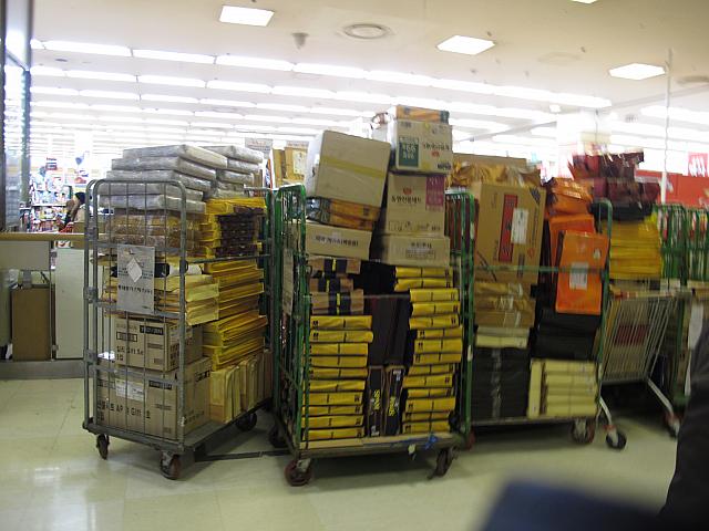 そして、配送手配がされたソンムルセットが山積みです!!ここから、バンバン外に待機してるトラックに詰め込まれていきます。今週末、韓国国民の大移動が繰り広げられることでしょう。ソウルに来られる方は、ソウルにあまり人がいなくてびっくりしちゃうかも!?