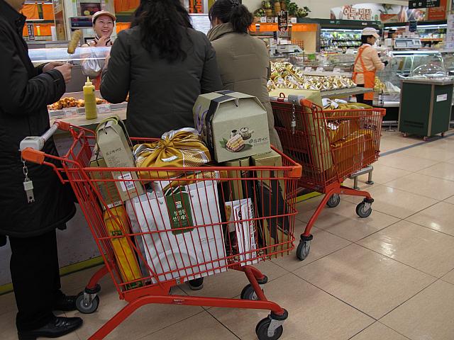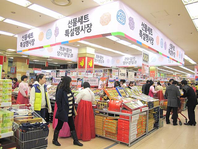 なぜかというと、そう!今週末はソルラル(旧正月)。みなさん、ソンムルセット(お土産セット)を送ったり、実家に新年の挨拶に向かいます。こちらはロッテマートソウル駅店。たくさんのソンムルセットがずらり。