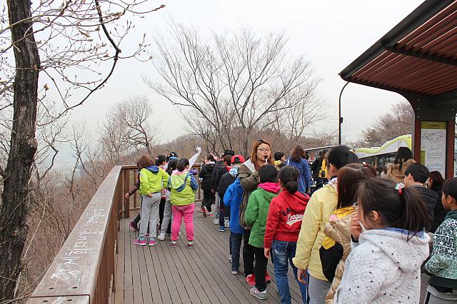 今回は、地下鉄3号線トンデイック(東大入口)駅すぐ近くの新羅ホテル裏(奨忠公園前)からスタート!しばらく歩いてバンヤンツリーホテルの中を抜け、国立劇場の脇から南山の山頂まで歩く約3km、1時間半くらいのコース。この日はちょっと曇りがちだけど、散歩するにはなかなか気持ち良い陽気^^ 桜以外にもケナリやツツジなどキレイな花も咲いていて、春の南山の景色を楽しみながら歩きます♪