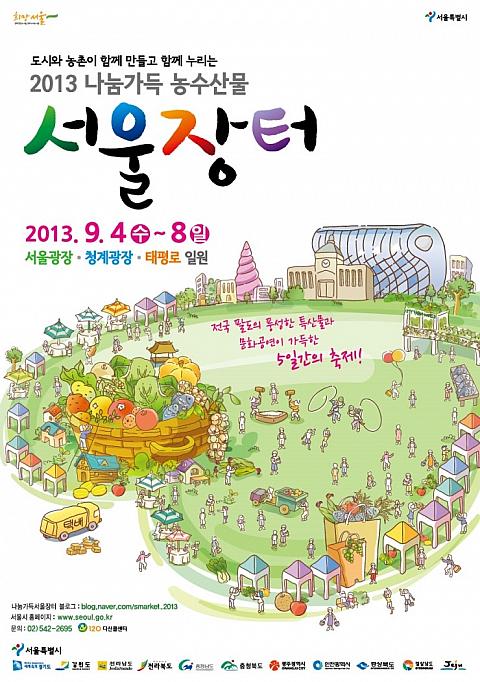 9月4日から9月8日まで、ソウル広場、清渓広場、太平路一帯で「2013分かち合いいっぱい農水産物ソウル市場」が開催されています。このお祭りでは農業特産物を広報・販売する直取引市場と伝統文化行事などが行われます。ソウル広場には133の市・郡が販売ブースを作り、米、高麗人参、いわし、みかんなど地方の特色のある商品2千種余りが販売されます。その他にも各地方の代表的な文化公演やコンサートなどさまざまなイベントが行われます。