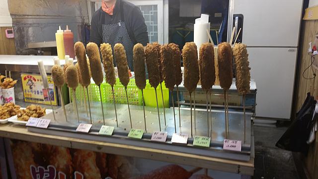 今、市場で一番話題の食べ物がコレ!日本ではアメリカンドッグと呼ばれるホットドッグ。日本ではソーセージの周りにパンケーキ生地でおおったシンプルスタイルが主ですが、こちらのお店は衣にポテトフライがついたタイプだけでなく、外側や中身にさまざまなトッピングを使用したメニューも!姿もぽっちゃり型からスリムまで幅広く、韓国のグルメテレビでも紹介されたので皆さんも是非一度チャレンジしてみてくださいネ。