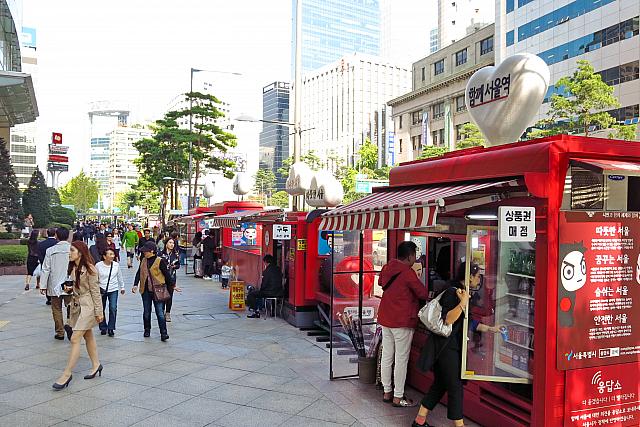 明洞(ミョンドン)のロッテ百貨店本店前の通り。いつのまにか露店がこんなかわいらしい箱みたいに。