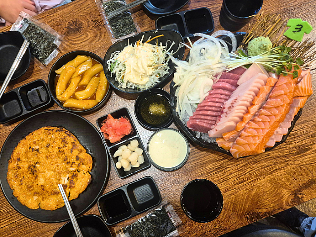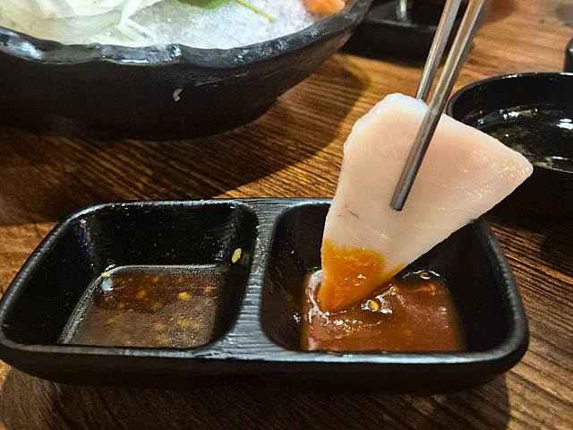 サーモンとまぐろのお刺身セット。お刺身がなくなれば、何度も追加可能です。