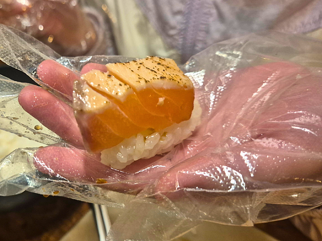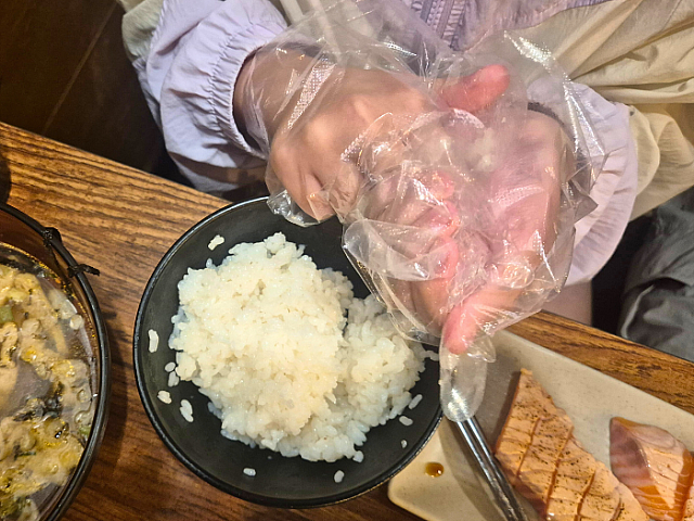 メニューに「セルフスシ(〜あなたも寿司王〜)」というのがあったので追加注文。衛生手袋とシャリが登場。