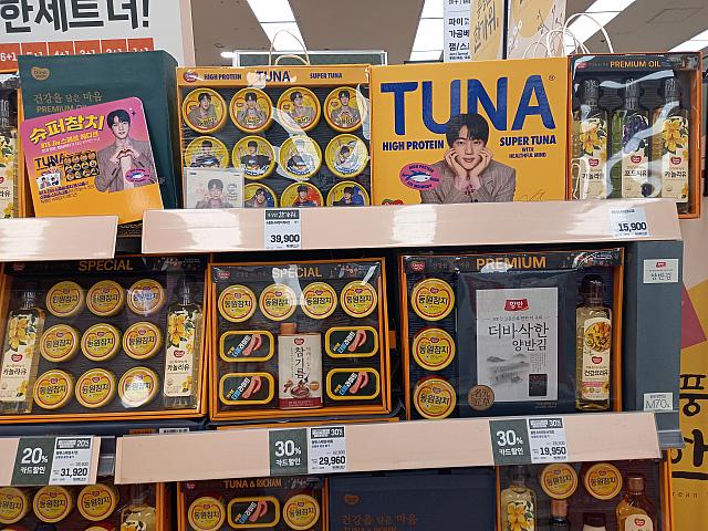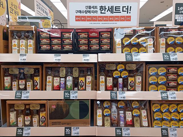 秋夕の前にはいつも大型マートやデパートに贈物セットの特設コーナーが登場します!↑贈物セットの定番、調味料&缶詰セット!