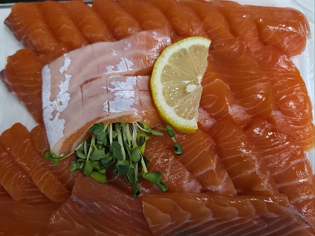 韓国では一番ポピュラーなヒラメの刺身とサーモンの盛り合わせ。