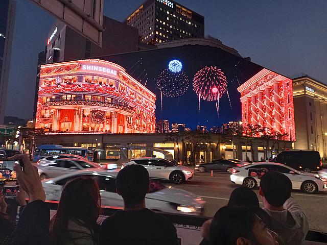 毎年恒例の明洞イルミネーションスポット、新世界デパートの向かいに人だかりができています~!
