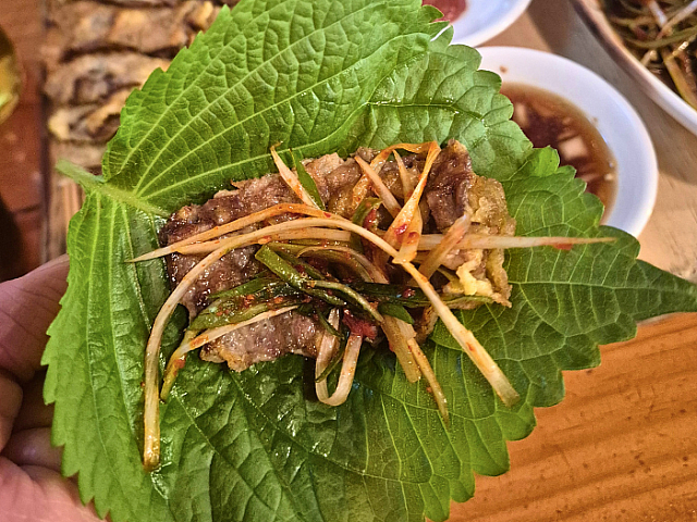 ネギの和え物(パチェムッチム)と特製ダレを合わせエゴマの葉で包んでいただきます。